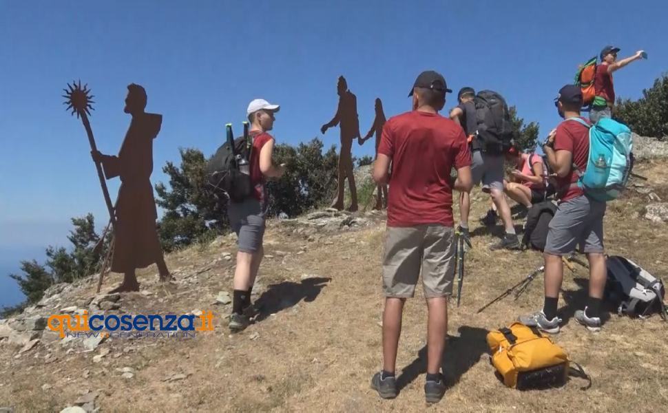 Parole inaspettate che invitano ancora di più alla meditazione, osservando da una radura, un panorama mozzafiato, che mostra la Valle del Crati e anche, in lontananza, la Sila e la città di Cosenza ai suoi piedi. Ad un bivio, una piccola deviazione per fare una “variante panoramica”, che porterà su Monte Palazzello, a circa 1350 metri, da dove la vista è ancora più straordinaria: si apre sul Tirreno, fino alle isole Eolie, e anche sullo ionio, fino al massiccio del Pollino, a nord. Qui ci sono delle suggestive sagome di acciaio, a grandezza naturale. Una è quella di San Francesco, rappresentato giovane, in cammino, seguito da alcuni pellegrini che, come lui, si sono posti in marcia. Anche questo è un luogo di meditazione ma anche un luogo per fare belle foto.