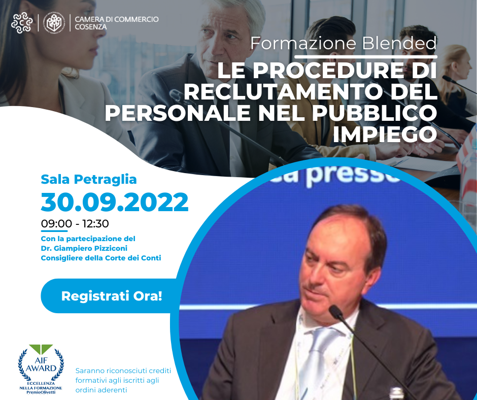 COSENZA – Tornano le iniziative formative in presenza alla Camera di Commercio. Venerdì 30 settembre, alle ore 9:00, presso la Sala Petraglia si terrà una giornata di formazione blended tenuta dal dott. Giampiero Pizziconi, Consigliere della Corte dei Conti, su “Le procedure di reclutamento del personale nel pubblico impiego”.