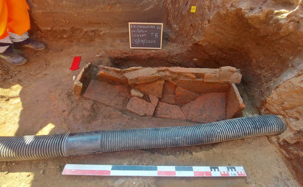 Contestualmente ai numerosi lavori che quotidianamente interessano la città e, nello specifico, lungo il tratto dell’attuale Via Popilia, in un’area non molto distante dal centro storico e dal corso del Crati, durante la realizzazione di una trincea per la posa di un cavidotto da parte di E-Distribuzione, sottoposta ad assistenza archeologica da parte della Soprintendenza, è stata individuata parte di una sepoltura, risparmiata dalle trincee pertinenti ai numerosi sottoservizi che, in passato, hanno interessato l’area oggetto dei lavori. Il tessuto della città moderna, come noto, si sovrappone in parte a quello del centro di età imperiale, che un tempo deve essere stata anche la “capitale” dei Brettii.
