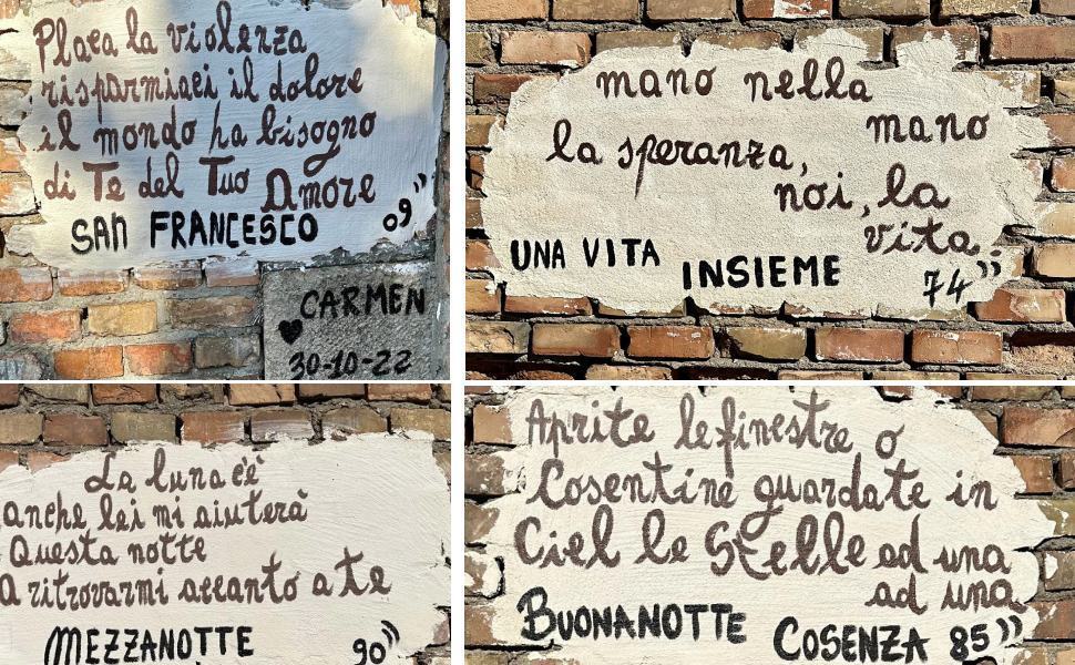 Le frasi delle canzoni più amate di Mario Gualtieri dipinte e impresse su un muro nel quartiere dove l’amato cantautore cosentino ha vissuto