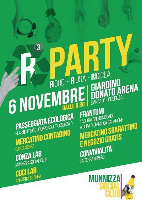 COSENZA – R③-Party (Riduci, Riusa, Ricicla) si sposta nei quartieri e domenica 6 novembre “traslocherà” nel quartiere San Vito. Il collettivo Munnizza Social Club sarà ospite dell’associazione La Spiga, una delle associazioni più attive e una delle realtà di volontariato da anni presente nel quartiere con le sue attività a favore di persone con disabilità e di minori a rischio di dispersione scolastica. L’evento si terrà nel Giardino Donato Arena, via Saverio Albo (meglio conosciuta come “villetta di S. Vito”) e, in caso di pioggia, si sposterà all’interno della sede dell’associazione La Spiga (alle spalle della villetta).
