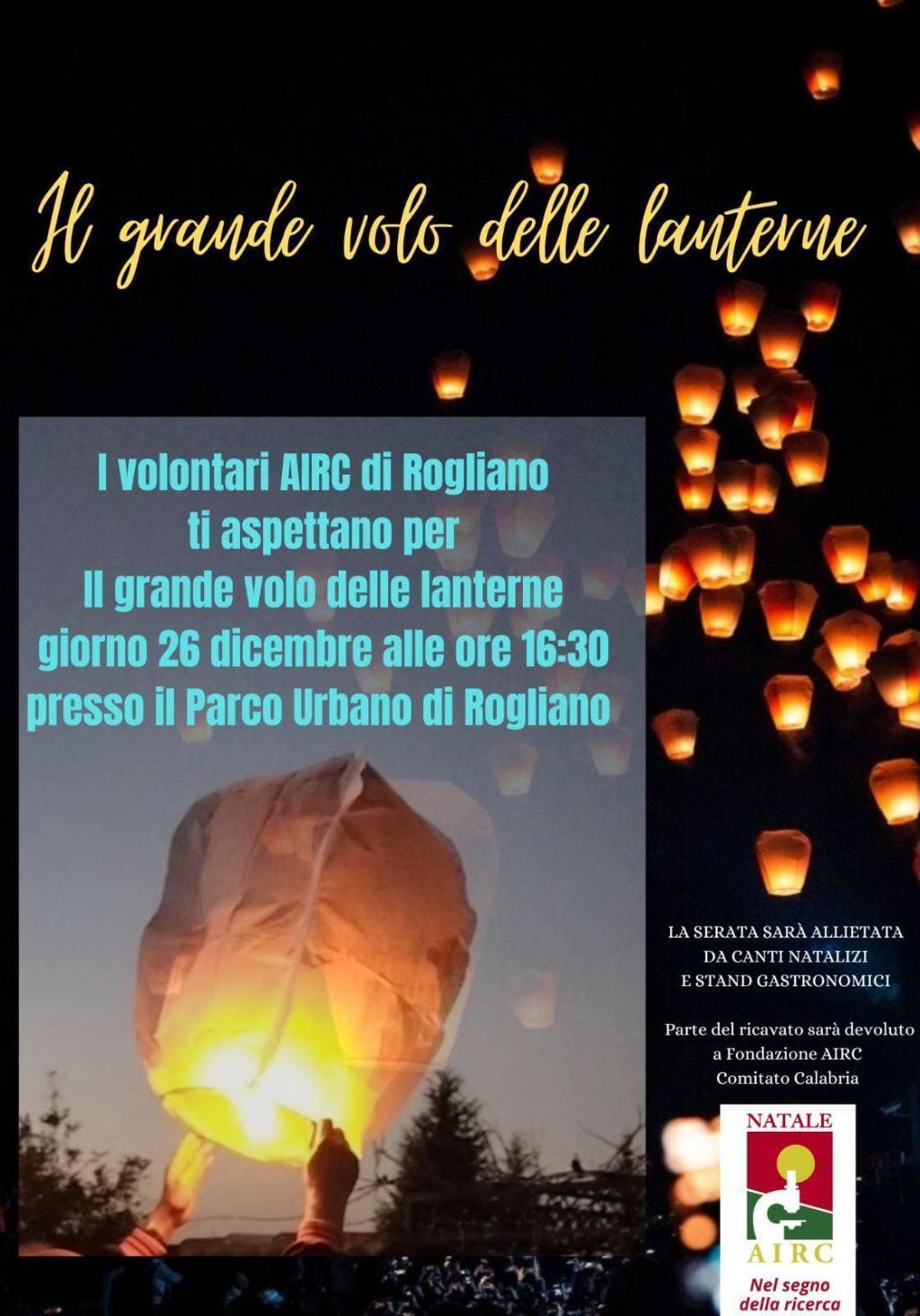 ROGLIANO (CS) – La Delegazione AIRC di Rogliano, in occasione delle Festività Natalizie replicherà l’iniziativa delle lanterne giunta alla 5^ edizione. Domenica 26 dicembre alle 16.30, nel Parco Urbano di Rogliano in Via E. Altomare, è in programma l’iniziativa benefica “Accendi una lanterna, fai volare la speranza”.