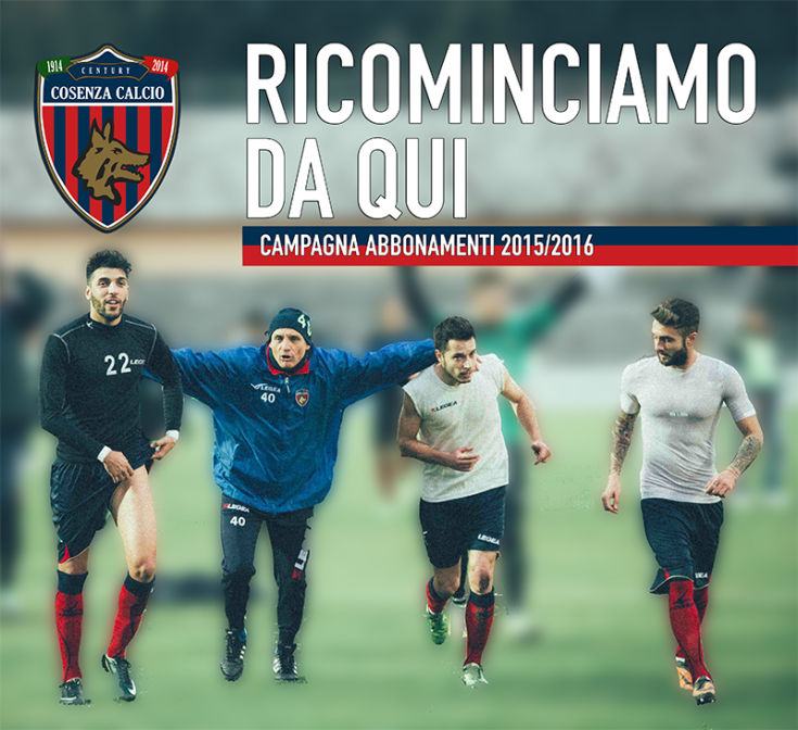 “La Società Cosenza Calcio comunica che domani, 27 agosto 2015 alle ore 10:00 presso lo Store, partirà ufficialmente la Campagna abbonamenti per la Stagione 2015/2016. Il Cosenza chiama a raccolta i suoi tifosi per una stagione che si preannuncia avvincente e auspica una risposta importante e una dimostrazione di fiducia e vicinanza alla squadra. La Società ha deciso di lasciare invariati, rispetto alla scorsa stagione, i prezzi dei biglietti validi per il singolo evento sportivo e ha inteso favorire chi sceglierà di dare la propria fiducia alla squadra, sottoscrivendo un abbonamento, praticando dei prezzi particolarmente convenienti. Confermata la Tessera Lupacchiotto per i tifosi under 14 che, al costo simbolico di 10 euro, permetterà di accedere per l’intera stagione in qualsiasi settore dello Stadio. Confermato anche il biglietto “Lupacchiotto” che, al prezzo simbolico di 1 euro, permetterà agli under 14 di entrare in qualsiasi settore dello Stadio. Si ricorda che gli abbonamenti, validi per 16 gare su 17 in programma * sono sottoscrivibili previa emissione gratuita della supporter card“.