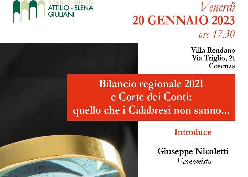 COSENZA – Domani alle 17,30, riprenderà l’attività di analisi e approfondimento dei problemi calabresi, inaugurata nei mesi scorsi dalla Fondazione “Attilio e Elena Giuliani”, con un interessante focus sul tema: “Bilancio regionale 2021e Corte dei Conti: quello che i Calabresi non sanno…”.