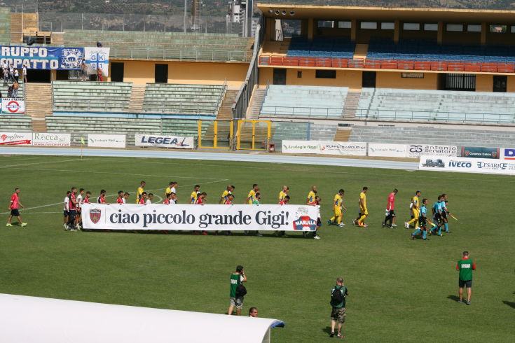 Entrano in campo le formazioni con i giocatori del Cosenza che espongono uno striscione dedicato a Marulla che recita: “ciao piccolo grande Gigi”