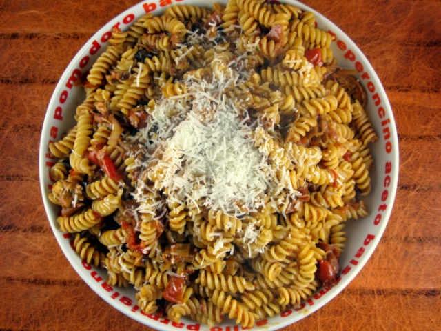 In un ampio tegame di coccio fate soffriggere con l’olio la cipolla finemente affettata e l’aglio che eliminerete appena dorato. Unite i pomodori privati dei semi e dell’acqua di vegetazione, i funghi tagliati a pezzetti (se secchi, li avrete già bene ammollati in acqua tiepida), le olive nere snocciolate e tagliate a metà, il peperoncino rosso tagliuzzato, il prezzemolo tritato, i semi di finocchio e il capocollo a striscioline. Saltate e fate cuocere a fuoco lento con il tegame incoperchiato. Lessate i fusilli al dente, sgocciolateli bene, metteteli in una capace insalatiera, conditeli con la salsa e cospargeteli di ricotta affumicata e stagionata grattugiata, bene amalgamandoli con l’aiuto di un forchettone di legno, versateli in una tortiera nella quale avrete messo qualche cucchiaiata di salsa e mettete in forno caldo per alcuni minuti. Per insaporire meglio i fusilli, o qualsiasi altra pasta che va condita nell’insalatiera, vi consigliamo di cospargere il fondo del recipiente da portata di abbondante formaggio (in questo caso di ricotta grattugiata). Versatevi sopra la pasta ben scolata, mescolate e condite con la salsa. In superficie un’ultima spolverata di formaggio.