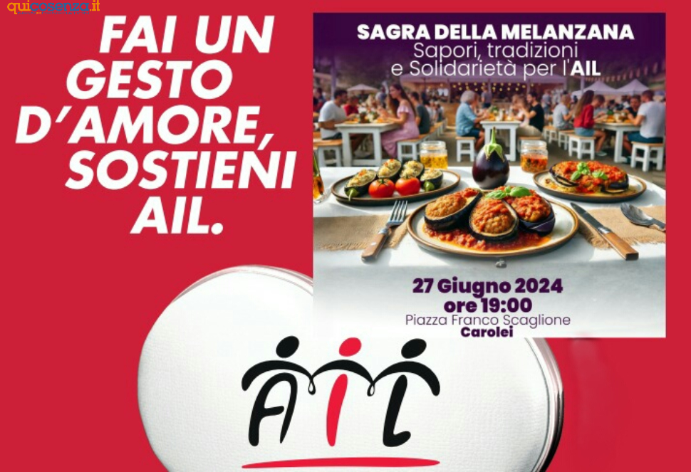 CAROLEI (CS) – Sabato 27 luglio, a Carolei, appuntamento imperdibile con la solidarietà in favore dell’AIL: l’Associazione Italiana contro le leucemie, linfomi e mieloma da sempre al fianco dei pazienti ematologici e delle loro famiglie.