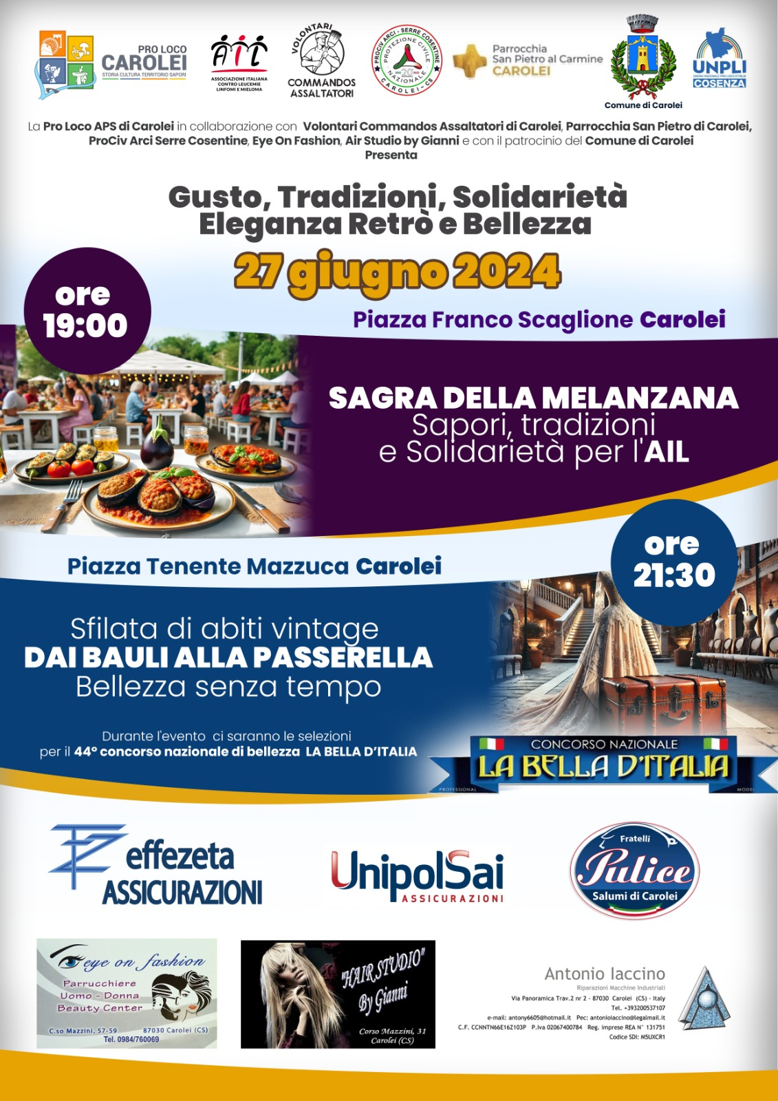 Insomma una serata quella di Carolei che regalerà: Gusto, Tradizione, Solidarietà, Eleganza Retró e Bellezza. Durante l’evento si terrà anche una sfilata di abiti vintage che farà rivivere le mode del passato e ammirare l’eleganza retrò con le selezioni del 44° Concorso di Bellezza. Una serata da non perdere!