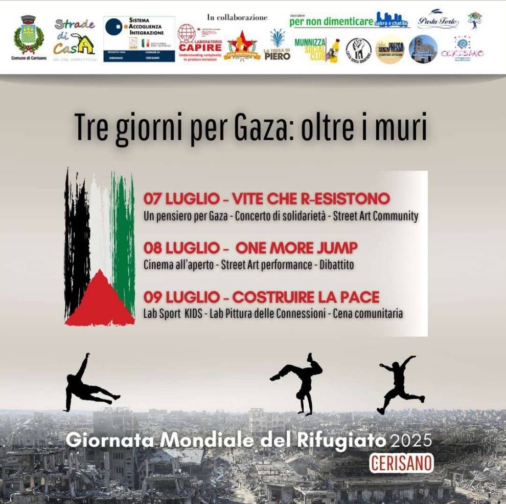 Dal 7 al 9 luglio, Cerisano si trasformerà in un laboratorio vivo di riflessione collettiva, dove arte, sport, musica e testimonianze si uniscono per raccontare storie di resistenza, accoglienza e costruzione di ponti tra i popoli. Gaza sarà il punto di partenza, ma lo sguardo sarà rivolto oltre il conflitto, per generare confronto, consapevolezza e comunità.