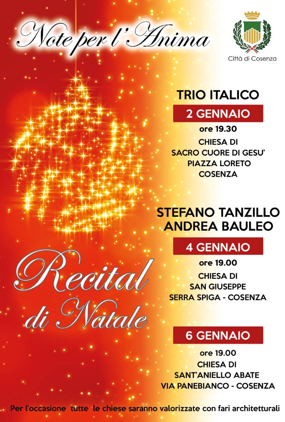COSENZA – La bellezza della musica e la profondità della spiritualità si intersecano nel progetto “Note per l’anima”, che propone un ciclo di tre eventi musicali itineranti. Si tratta di un affascinante viaggio, tra note e fede, che farà tappa in tre chiese di grande valore storico e artistico della città di Cosenza, che per l’occasione si trasformeranno in palcoscenico in cui si potrà vivere l’arte come ponte tra il sacro e il profano. Con “Note per l’anima” ci si propone di valorizzare il patrimonio culturale delle chiese che ospiteranno gli eventi ed, al contempo, di promuovere la musica come linguaggio universale in un incontro unico tra arte e fede. Le chiese saranno impreziosite da un allestimento di luci architetturali, sia all’interno che all’esterno, che esalterà la bellezza dei luoghi, rendendo l’atmosfera ancora più magica e coinvolgente.