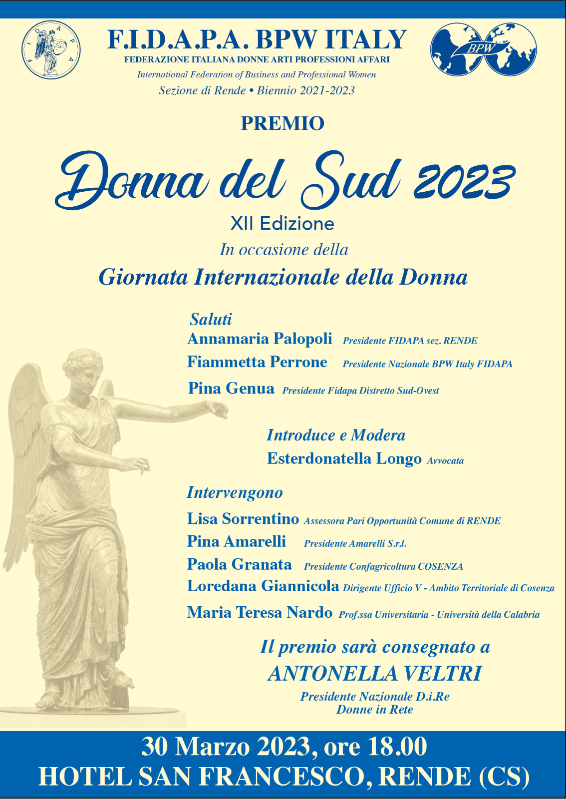 RENDE – Sarà Antonella Veltri, Presidente Nazionale D.i.Re (Donne in rete contro la violenza) a ricevere il Premio “Donna del Sud” 2023. La cerimonia si terrà giovedì 30 marzo alle ore 18.00, presso l’hotel San Francesco a Rende. Giunto alla sua XII edizione, il Premio istituito dalla Fidapa di Rende, rappresenta un riconoscimento alle donne che si sono contraddistinte per il loro operato e per il loro impegno.