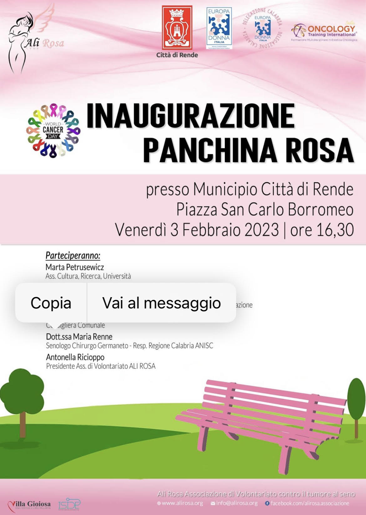 Dopo la cerimonia di inaugurazione, ci sarà un incontro al quale parteciperanno le Assessore Marta Petrusewicz e Lisa Sorrentino, la Consigliera Marisa De Rose, Maria Renne Senologo Chirurgo Germaneto – Resp. Regione Calabria ANISC e Antonella Ricioppo, Presidente Ass. di Volontariato Ali Rosa. Infine, il municipio si tingerà di rosa nel weekend a simboleggiare sostegno e vicinanza a chi lotta contro il cancro.