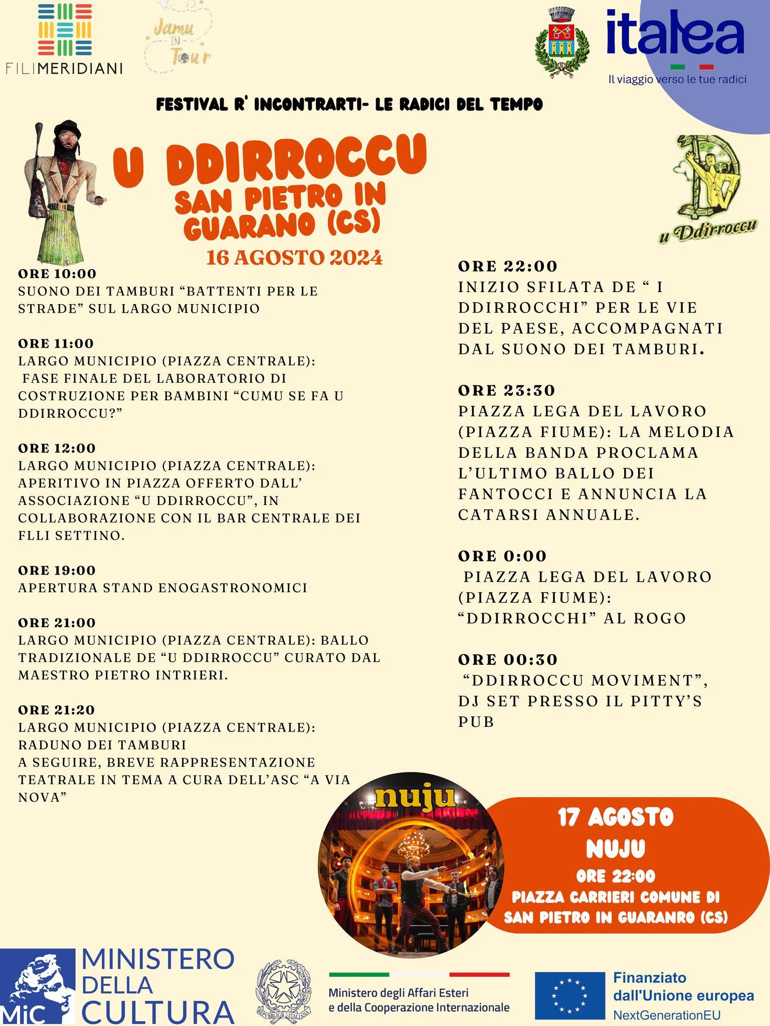 I giovani dell’associazione “U Ddirroccu” , in collaborazione con l’amministrazione comunale e con il contributo relativo al bando sul Turismo delle radici (nell’ambito del progetto Festival R’incontrArti, le radici del tempo “U Ddirroccu”) , hanno reso possibile un evento dal carattere prettamente originale, autentico.