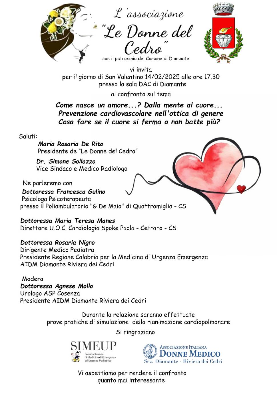 Ai saluti della Presidente Maria Rosaria De Rito e del vicesindaco di Diamante Simone Sollazzo, seguiranno le relazioni della Dott.ssa Francesca Gulino Psicologa Psicoterapeuta presso il Poliambulatorio “G. De Maio” di Quattromiglia di Rende, della Dott.ssa Maria Teresa Manes direttore presso l’U.O.C. Cardiologia Spoke Paola-Cetraro e della Dott.ssa Rosaria Nigro Presidente per la Regione Calabria di medicina di emergenza/urgenza dell’Associazione Italiana Donne Medico- Sez. Diamante-Riviera dei Cedri. Modererà il dibattito la Dott.ssa Agnese Mollo, Urologo in servizio presso l’Asp di Cosenza.