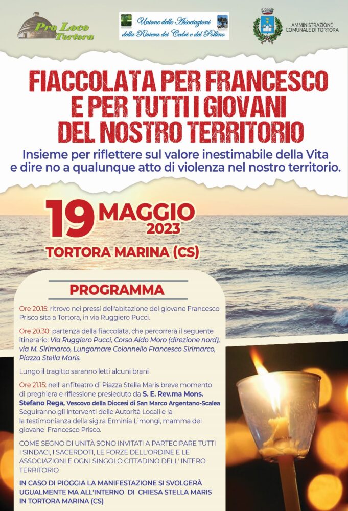 La manifestazione si svolgerà in tre momenti: il primo sarà una fiaccolata per le vie di Tortora Marina, con raduno e partenza dalla casa del giovane Francesco in via Ruggiero Pucci alle 20:15. Il secondo sarà un breve momento preghiera presieduto da S.E. Rev.ma Mons. Stefano Rega, Vescovo della Diocesi di San Marco Scalea. Il terzo, sarà dedicato alla riflessione, con gli interventi delle autorità locali e la testimonianza della mamma del giovane Francesco Prisco. In caso di pioggia la manifestazione si svolgerà comunque ma in forma statica presso la Chiesa Stella Maris. All’iniziativa sono invitati gli attori di tutto il comprensorio: sindaci, sacerdoti, scuole, associazioni e singoli cittadini.