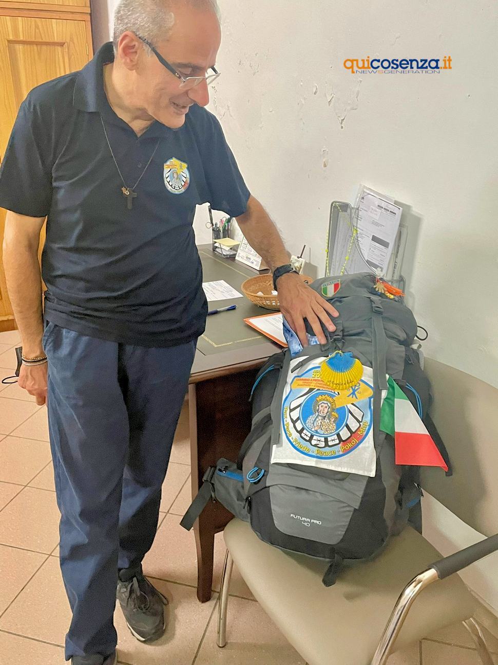 Il fisico appare esile, le spalle un po’ curve. E dici dentro di te: ma questo dove pensa d’andare? Poi succede che sorride, gli occhi s’illuminano e quasi ti vergogni: quest’uomo è forte e arriverà lontano. Don Santo Borrelli ha poco più di mezzo secolo di vita. Sacerdote da 32 anni, gli ultimi cinque alla guida della parrocchia di Donnici. Al collo un crocifisso di legno, addosso una maglietta blu che, all’altezza del cuore, è contrassegnata da uno stemma: “L’ho disegnato io e ora ti spiego cosa significa. Questa che vedi in alto è la freccia di Santiago, che indica il cammino. La conchiglia è simbolo di pellegrinaggio. In basso il filo spinato di Auschwitz, la parola pace scritta in lingue diverse e, infine, l’immagine della Madonna di Czestochowa alla quale il cammino è consacrato”. Lo senti parlare e capisci che, senza una prima bruciante domanda, sarebbe difficile andare avanti nella conversazione. E allora, di getto: perché lo fa? E lui, con disarmante tranquillità: “Il cammino è il segno della vita”. Forse sarebbe stato meglio mordersi la lingua, ma poi il racconto continua, capisci che, nell’incredulità, sei in buona compagnia e quel senso di velata stupidità che t’aveva assalito, come d’incanto svanisce: “Una fresca mattina d’agosto di un anno fa, quando ancora tutti dormivano, mi sono chiuso alle spalle il portone della chiesa e mi sono messo in cammino fino a San Pietro.