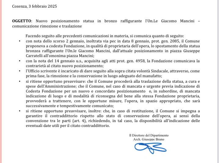 «A coloro i quali in queste ore – concludericeveranno l’ordine di rimuovere la statua di non eseguirlo. Gli atti illegittimi e contro la legge non devono essere eseguiti. Stiamo continuando dopo la manifestazione del 18 gennaio, la battaglia a difesa di uno dei più bei simboli della Città di Cosenza, affinchè la si possa sconfiggere così come gli atti di arroganza. C’è bisogno della mobilitazione di tutti. Insieme potremo difendere uno tra gli elementi più iconici della nostra città».