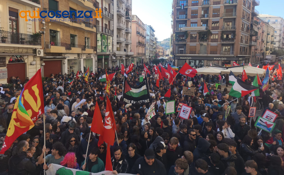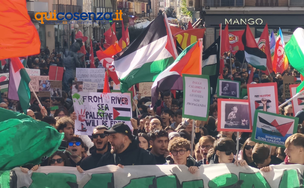 COSENZA – Anche Cosenza si unisce alla mobilitazione nazionale per la Palestina. Dopo la grande partecipazione alla manifestazione a settembre, che ha visto oltre mezzo milione di persone in piazza in tutta Italia, e il corteo di ieri sera, ancora una volta la città dei Bruzi risponde ‘presente’ con una manifestazione che attraversa le strade del centro in direzione del Comune per poi risalire verso via Roma.