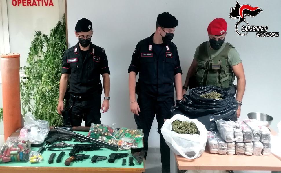 Rinvenuti un mitra da guerra, cinque pistole, due fucili e quasi un migliaio di munizioni di vario calibro. Scoperta anche una piantagione di marijuana