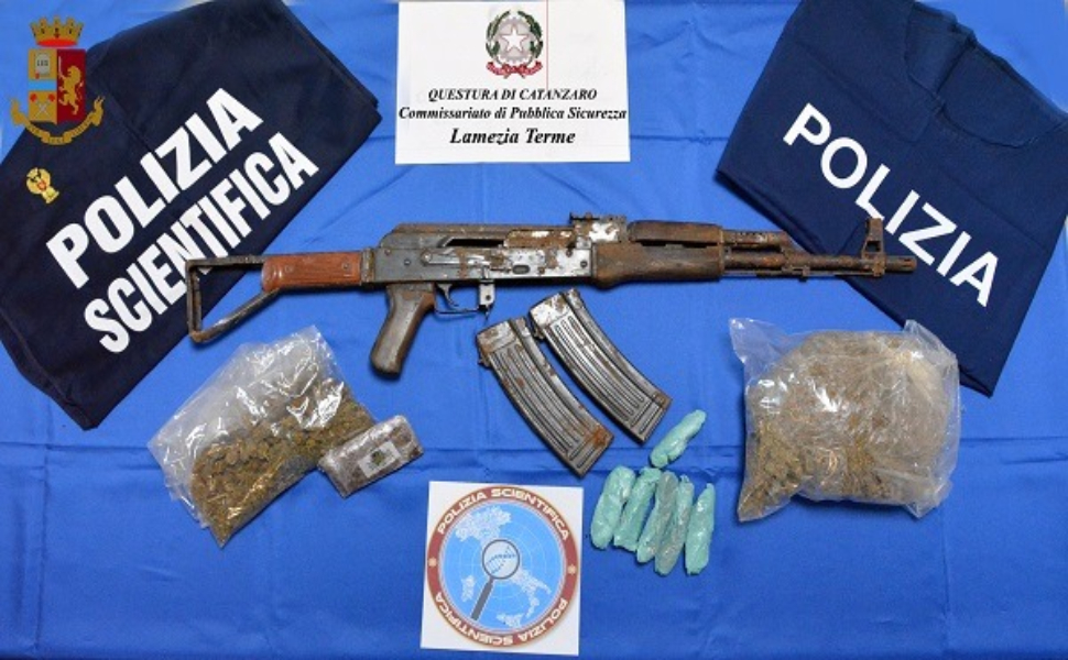 In un’altra perquisizione, effettuata su un terreno attenzionato da un cane antidroga, sono stati ritrovati altri 319 grammi di marijuana e 96 grammi di hashish, oltre a un fucile mitragliatore di tipo Kalashnikov.