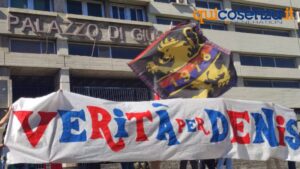 COSENZA – Hanno deciso di aspettare davanti al Palazzo di Giustizia dove oggi, potrebbe essere emessa la sentenza dopo il lungo e intricato processo per la morte di Donato Bergamini, a quasi 35 anni, nei confronti di Isabelle Internò. Un gruppo di tifosi rossoblù ha posizionato sulle scalinate e all’ingresso del Tribunale lo striscione con i colori rosso e blu, il numero ‘8’ e anche quello con su scritto “Verità per Denis”. Presenti anche alcuni ex calciatori del Cosenza Calcio: Michele Padovano, Ciccio Marino, Alberto Urban, Gigi Simoni, Ugo Napolitano e con loro anche Padre Fedele Bisceglia.