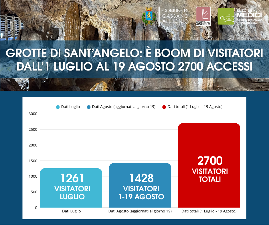 CASSANO IONIO (CS) – Cresce l’interesse e l’entusiasmo attorno alle Grotte di Sant’Angelo, il suggestivo complesso carsico situato nel cuore del territorio di Cassano Ionio, riaperto il 20 marzo dopo un lungo periodo di chiusura, che si conferma una delle mete più amate e frequentate dell’estate 2025. A dirlo sono i numeri: 2.700 visitatori in meno di cinquanta giorni, a testimonianza del grande richiamo che le grotte stanno esercitando. Nel mese di luglio sono stati 1.261 i biglietti staccati, mentre dall’1 al 19 agosto si contano già 1.428 paganti.