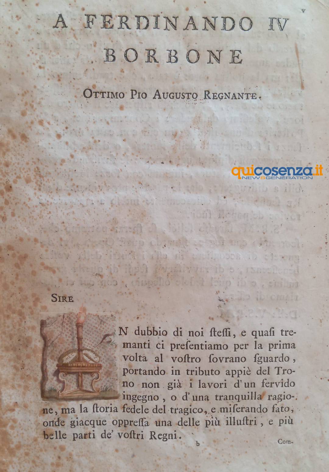 In misura decisamente minore, anche la provincia di Cosenza fu duramente colpita da quello che l’Istituto Nazionale di Geofisica e Vulcanologia inserisce tra i periodi sismici più lunghi e disastrosi della storia italiana. Lo stato dei luoghi viene documentato e restituito al re delle Due Sicilie Ferdinando IV di Borbone da un gruppo di 13 studiosi della Reale Accademia delle Scienze e delle Belle Lettere di Napoli.