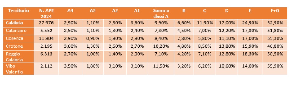 La situazione a livello provinciale evidenzia un maggior numero di edifici di classe F e G (consumi più elevati) nella provincia di Vibo Valentia (55,90%) e in quella di Cosenza (55,30%), a seguire Catanzaro (51,80%) e Reggio Calabria (50,50%): i dati sono del 2024.
