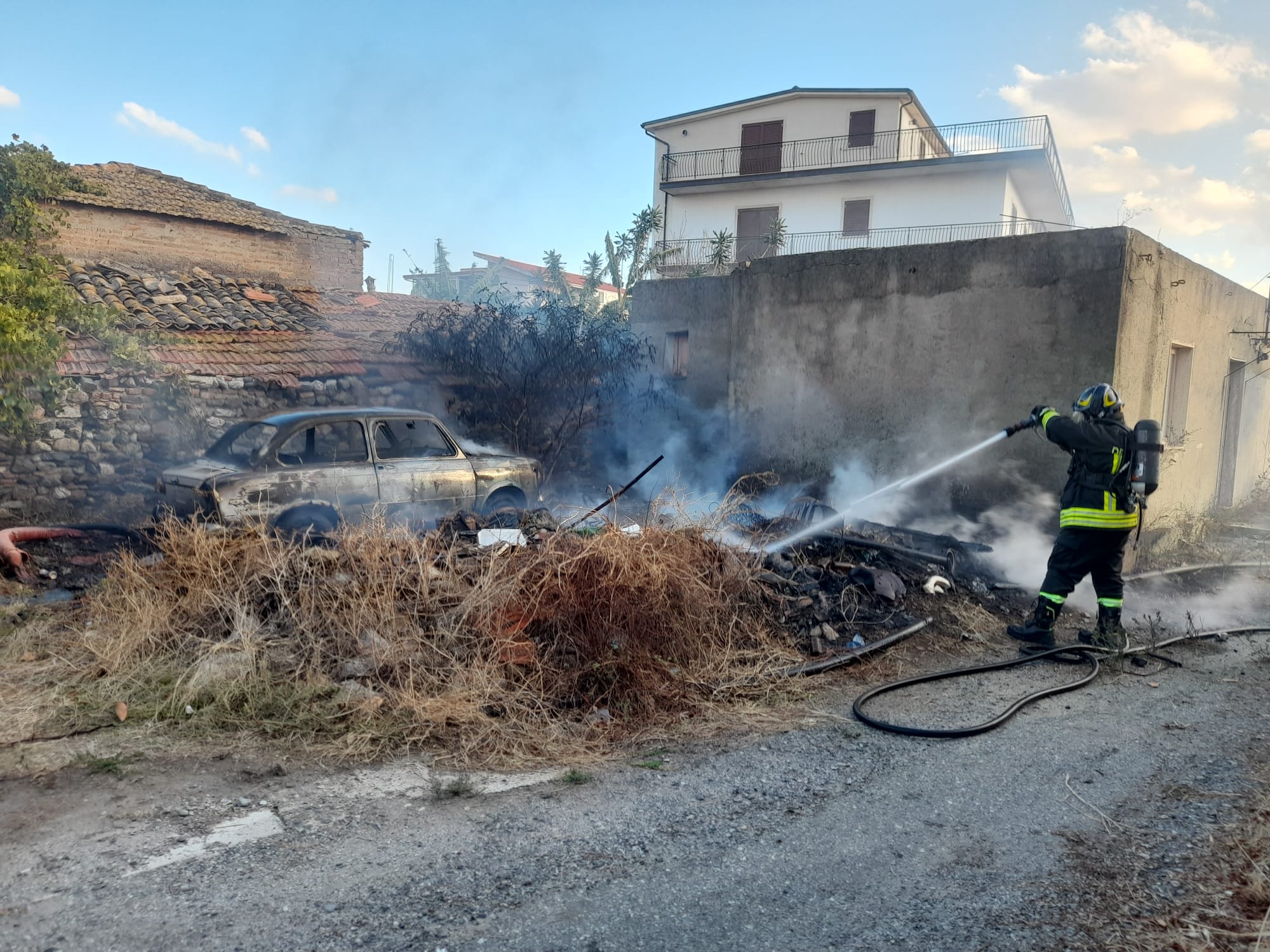 SAN GREGORIO (RC) – Momenti di paura nel pomeriggio di oggi a San Gregorio, periferia sus della città metropolitana di Reggio Calabria. Intorno alle 17, nei pressi del mercato ortofrutticolo, un incendio ha interessato un casolare abbandonato. Le fiamme, la cui origine è ancora da chiarire, si sono rapidamente propagate a una vicina abitazione utilizzata come deposito e a un’auto lasciata sul posto, probabilmente abbandonata. Sul posto sono intervenuti i Vigili del Fuoco di Villa San Giovanni che, dopo circa due ore di lavoro, sono riusciti a domare l’incendio evitando che si estendesse ai terreni circostanti. Non si registrano feriti, ma restano danni agli immobili e al veicolo coinvolti.