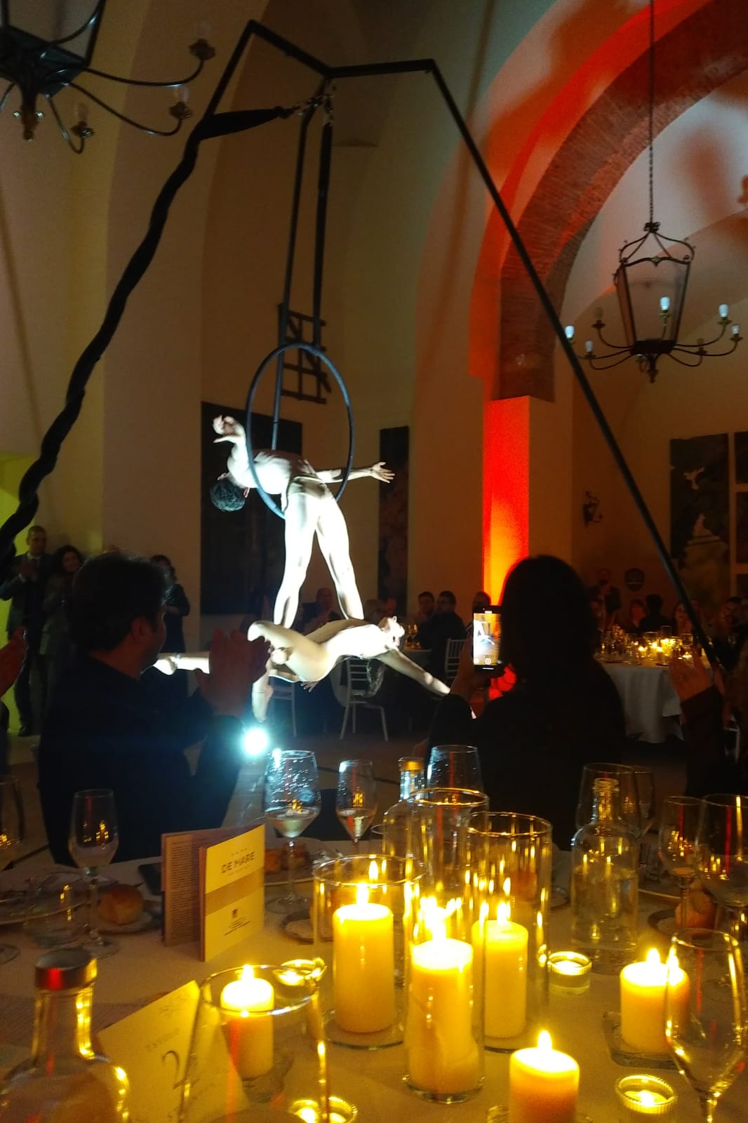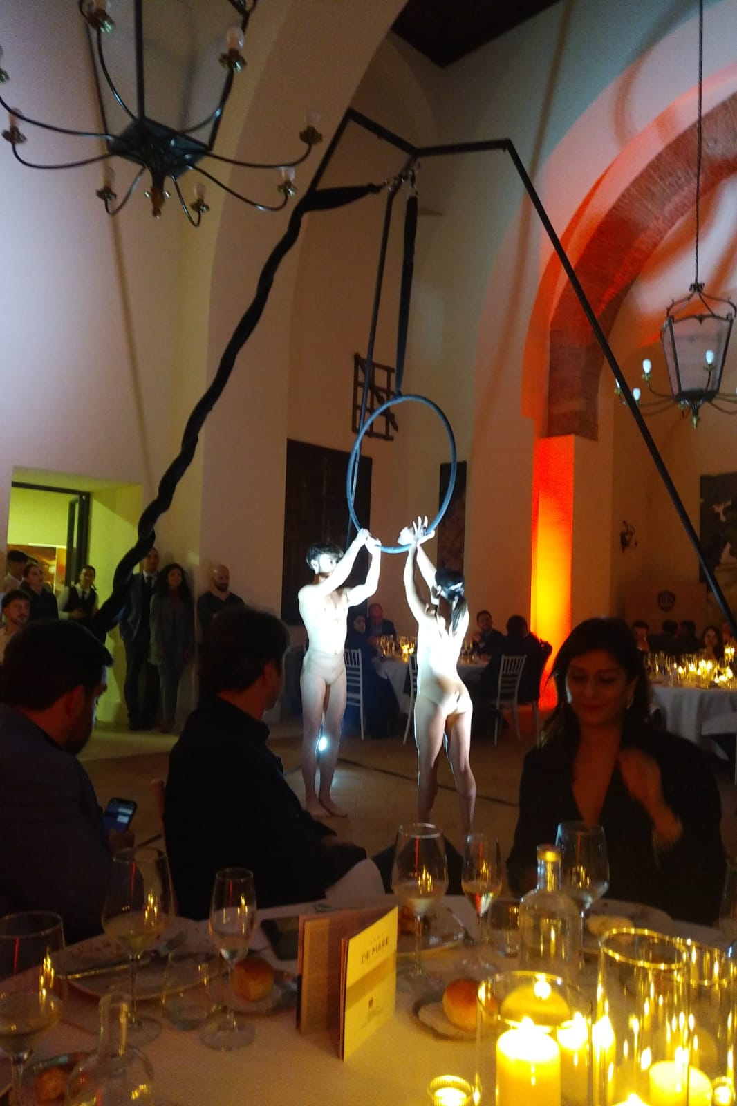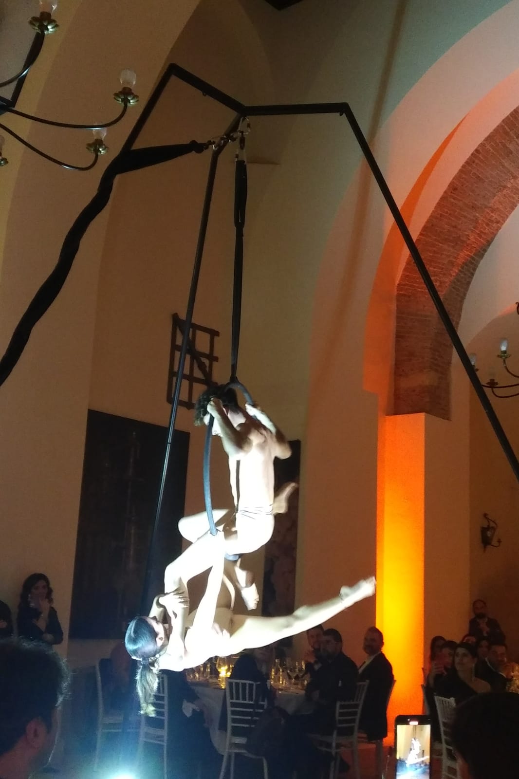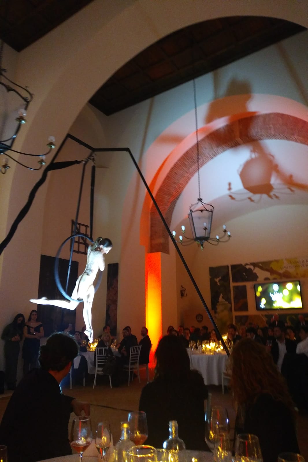 Delizie per il palato e per lo spirito, in un connubio perfetto reso tale proprio grazie all’armonia dell’intero contesto organizzato da Francesco Pascuzzi e da Cristina Raffaele.   Non solo enogastronomia, però. Uno dei “piatti” forti della cena, sono stati i numeri di danza aerea eseguiti dal vivo nelle grandi sale dell’enoteca da sei artisti della Compagnia “Spazio Create” che si sono esibiti su vari attrezzi e stoffe, appesi a trapezi giganti.