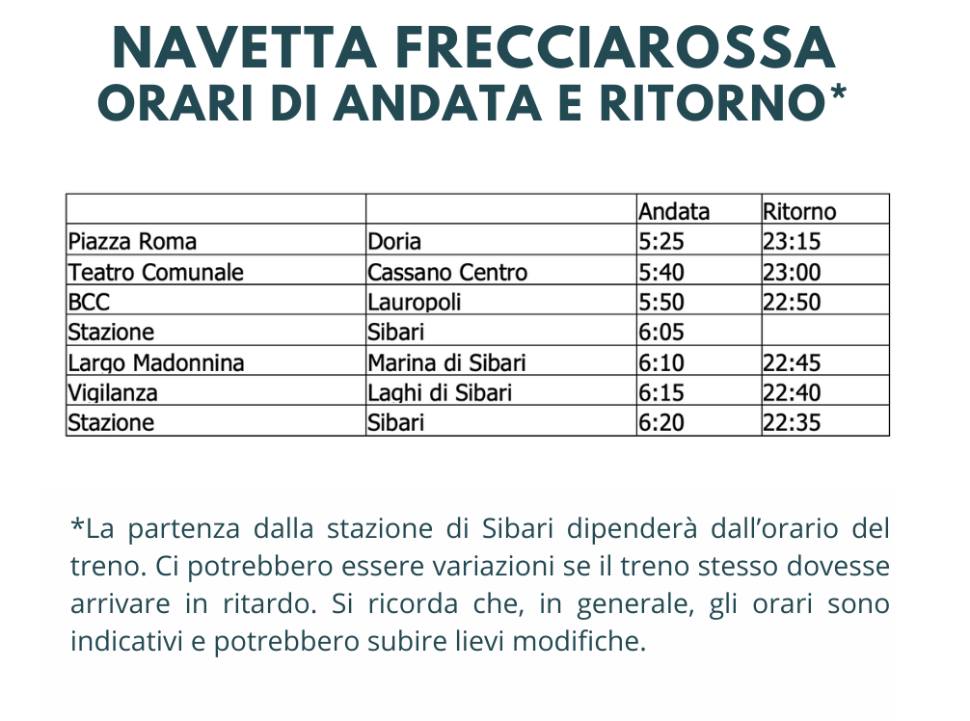 Nel dettaglio, gli orari che saranno in vigore fino al prossimo 15 settembre, sono i seguenti: partenza da Piazza Roma a Doria alle 5:25. Soste a Cassano centro, al Teatro comunale alle 5:40, alla BCC a Lauropoli alle 5:50, alla Stazione di Sibari alle 6:05 e poi secondo giro con sosta al Largo della Madonnina a Marina di Sibari alle 6:10, alla Vigilanza dei Laghi di Sibari alle 6:15 e secondo arrivo alla Stazione di Sibari alle 6:20. Al ritorno, una volta arrivato il Frecciarossa, partenza in direzione Vigilanza dei Laghi di Sibari alle 22:40, cinque minuti dopo al Largo della Madonnina a Marina di Sibari, alle 22:50 alla BCC a Lauropoli, alle 23:00 al Teatro Comunale a Cassano centro e fine corsa alle 23:15 a Piazza Roma.