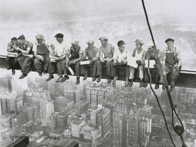 Un gruppo di muratori in pausa pranzo durante la costruzione del grattacielo Rca nel complesso del Rockefeller Center, a New York.