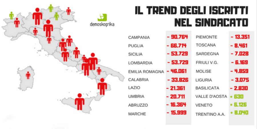 Nel Mezzogiorno quasi il 70% del calo complessivo italiano. Andamento negativo anche per chi ha svolto attività gratuita nelle organizzazioni sindacali: 60 mila volontari in meno...
