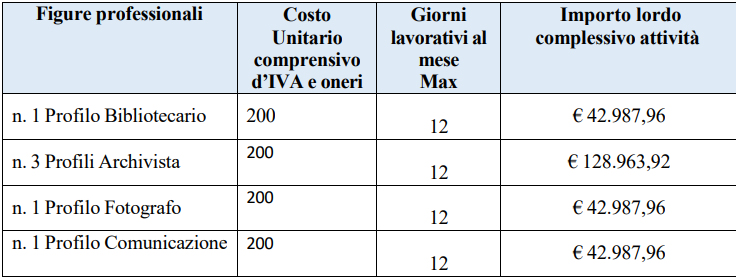 L’intero costo derivante dalla sottoscrizione dei relativi contratti di collaborazione professionale è a carico delle risorse del Progetto PNRR-M1C3-Cultura 4.0 – M1 Investimento 1.1 “Strategie e piattaforme digitali per il patrimonio culturale” – Sub-investimento 1.1.5 “Digitalizzazione del patrimonio culturale”. Il costo totale delle prestazioni, comprensivo di IVA e oneri, è di euro 276.242,40 secondo le disposizioni attuative contenute nella Circolare n. 4 del 18/01/2022 diviso secondo il seguente prospetto: