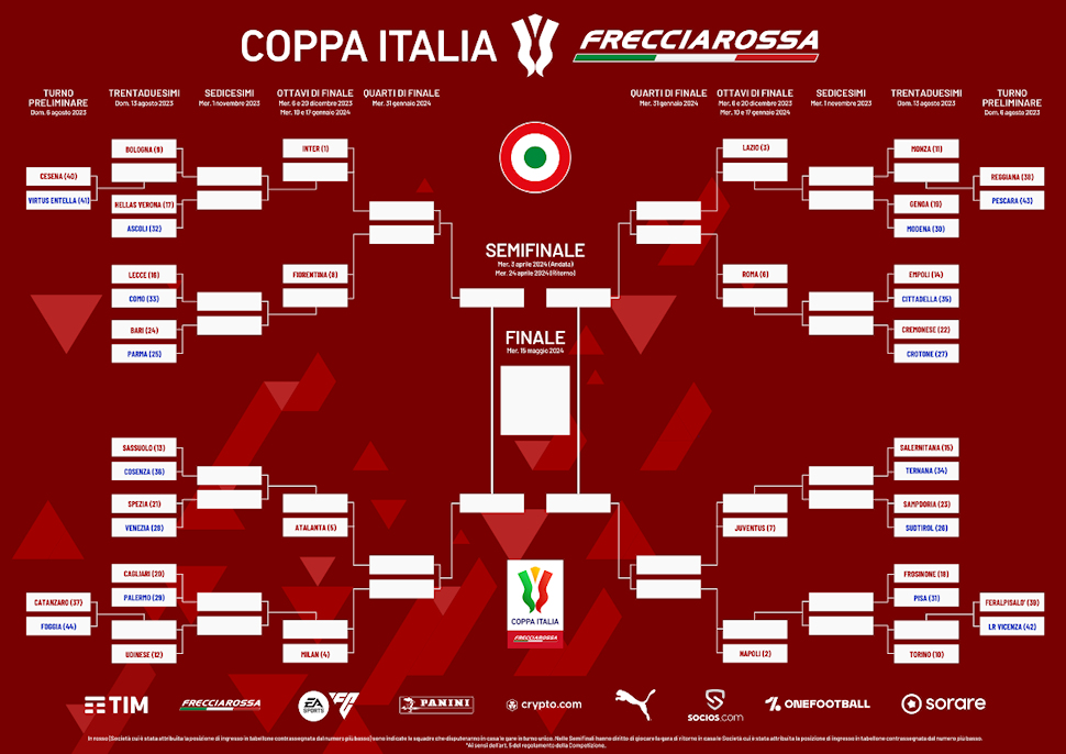 Dunque i rossoblù di Fabio Caserta scenderanno in campo contro gli emiliani nei 32° di finale domenica 13 agosto 2023 alle ore 18:00 al “Mapei Stadium” di Reggio Emilia. La gara sarà trasmessa in diretta TV su Italia Uno. La vincente della sfida tra rossoblu e neroverdi affronterà la vincitrice dell’altro match dei 32esimi di finale tra Spezia e Venezia nei sedicesimi. Negli ottavi di finale ci sarà l’Atalanta. La finale della coppa Italia è prevista allo stadio Olimpico di Roma il 15 maggio 2024.