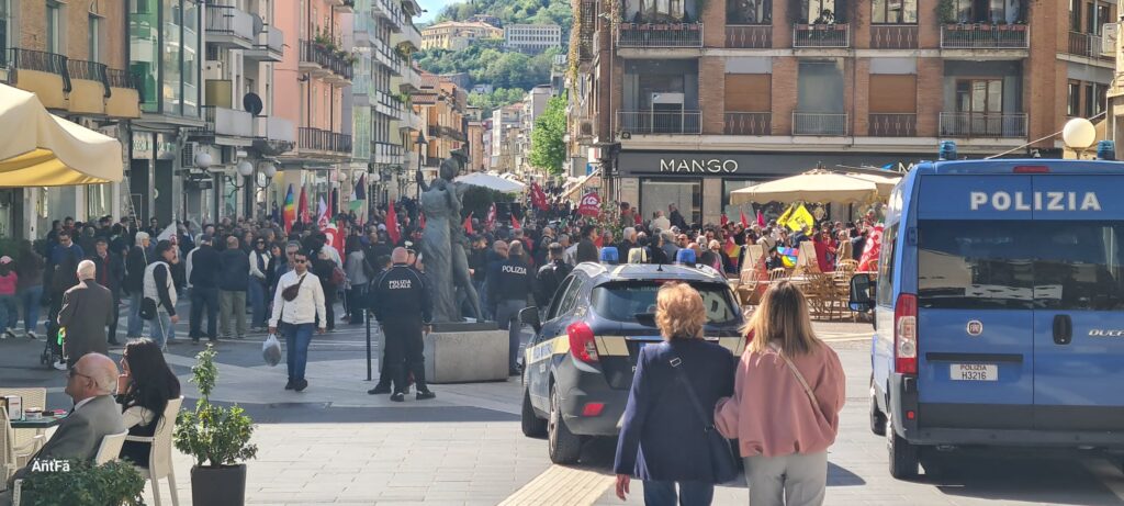 Il corteo si è poi spostato a Largo Partigiani, verso il centro storico, dove la manifestazione è proseguito con le dichiarazioni del sindaco Franz Caruso che ha lanciato un attacco al ministro Crosetto il quale non ha espresso alcuna posizione né sul fascismo né sull’antifascismo, nel giorno della Festa della Liberazione.