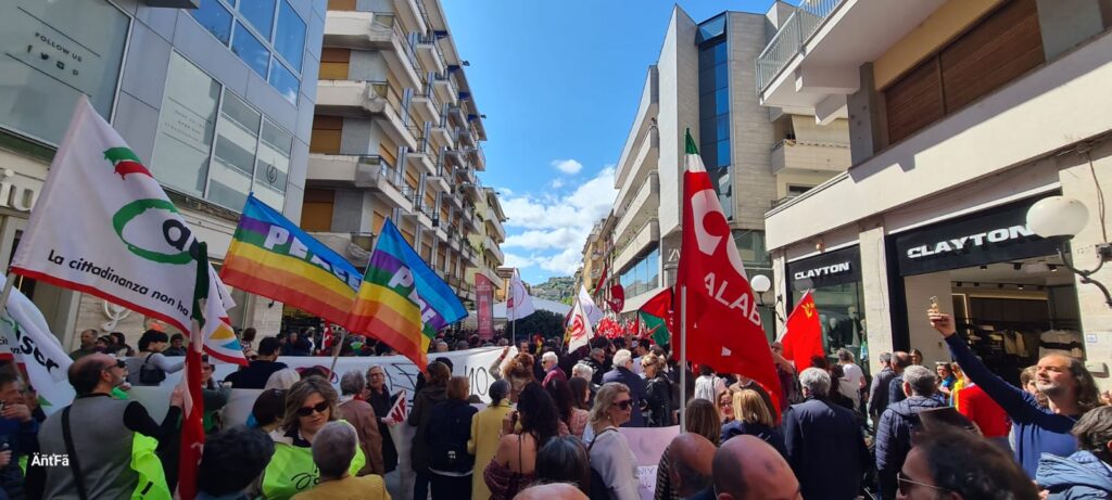 COSENZA – Corteo antifascista a Cosenza in occasione dell’ottantesimo anniversario della Liberazione. Alcune centinaia di persone hanno sfilato lungo le vie del centro cittadino, scandendo slogan per la pace e per la “Palestina libera”. Presenti alla manifestazione rappresentanti della Cgil e dell’Unione sindacale di base, di PD, Movimento 5 Stelle, Alleanza Verdi e Sinistra, Partito socialista italiano e Rifondazione comunista, dell’Anpi e di vari gruppi sociali, insieme a studenti e cittadini. C’é stato anche un applauso corale in omaggio a Papa Francesco. Una festa della memoria, accompagnata da un messaggio: “la Resistenza continua, oggi come allora, nella difesa dei diritti e della Costituzione”.