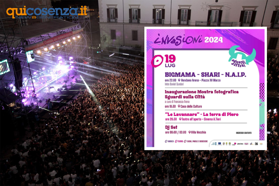 Il sindaco Franz Caruso e la consigliera delegata Antonietta Cozza, dopo aver ricordato che tutta la sezione teatrale di “Invasioni” è dedicata a Franco Dionesalvi e Antonello Antonante, hanno ribadito l’invito a partecipare numerosi alle tre iniziative di venerdì 19 luglio. La prima, per come detto, alle 18.30  alla Casa della Cultura per la mostra fotografica “Sguardi sulla città”, a cura di Francesco Arena, che sarà visitabile per tutto il periodo del Festival con ingressi gratuiti per come sono tutti gli spettacoli e le iniziative in cartellone. Alle 20.30, al Teatro all’aperto del Cinema Tieri, andrà in scena “Le Lavannare”, commedia ideata e scritta da Sergio Crocco, presidente dell’organizzazione di volontariato La Terra di Piero. Infine, a partire dalle 22.00, spazio alla musica con la prima line-up del Festival: sul palco di Piazza XV Marzo saliranno BigMama, Shari e N.A.I.P.. Tre giovani artisti, amati soprattutto dagli adolescenti, che propongono stili musicali differenti.