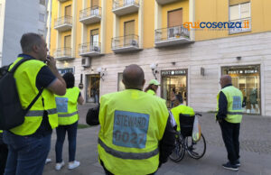 COSENZA – Detto fatto. Casacca gialla da lavoro e fischietto in bocca, come promesso gli steward che hanno lavorato per le partite del Cosenza Calcio, sono scesi in piazza questo pomeriggio per un sit-in di protesta a Piazza Kennedy. Chiedono le spettanze relative ai servizi espletati in occasione delle partite della squadra rossoblu. Parliamo di retribuzioni che vanno da ottobre 2023 a maggio 2024.
