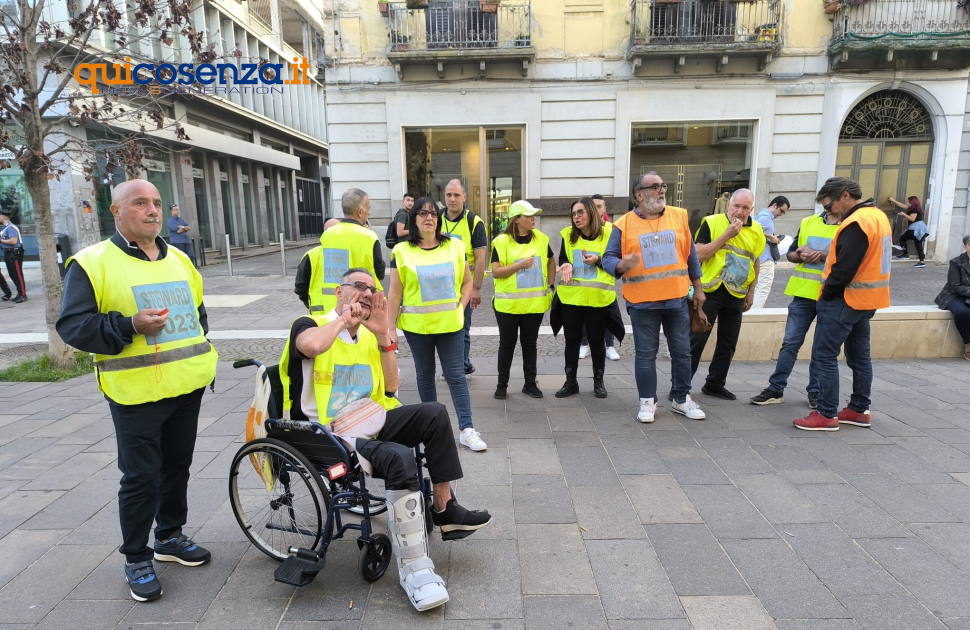 COSENZA – Detto fatto. Casacca gialla da lavoro e fischietto in bocca, come promesso gli steward che hanno lavorato per le partite del Cosenza Calcio, sono scesi in piazza questo pomeriggio per un sit-in di protesta a Piazza Kennedy. Chiedono le spettanze relative ai servizi espletati in occasione delle partite della squadra rossoblu. Parliamo di retribuzioni che vanno da ottobre 2023 a maggio 2024.