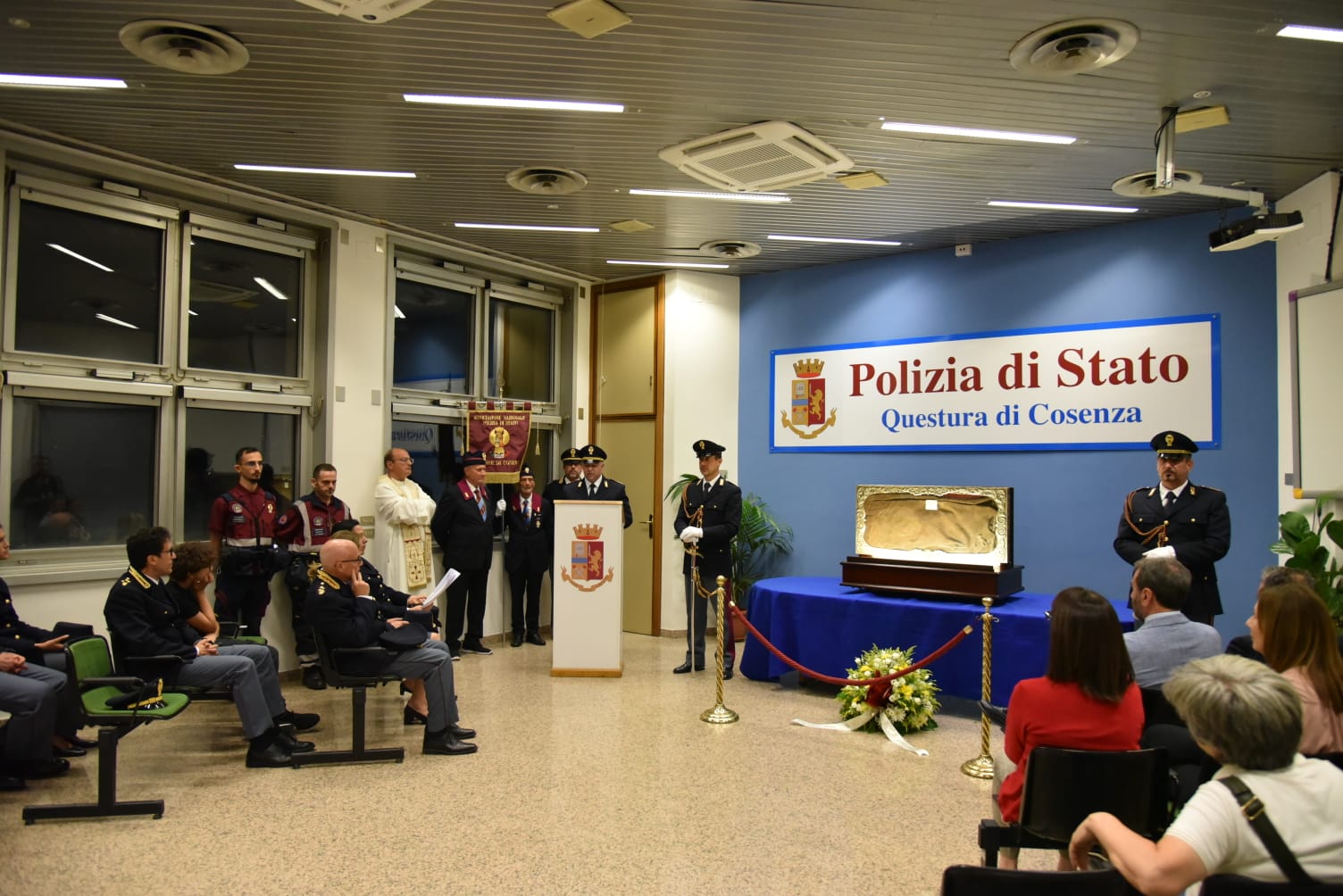 COSENZA – Il ‘Sacro Mantello’ di San Francesco di Paola ha fatto tappa oggi poco dopo la mezzanotte alla Questura di Cosenza dove è stata è stata scortata dagli agenti della Polizia di Stato all’interno della sala di rappresentanza per un momento di preghiera alla presenza del questore Giuseppe Cannizzaro e mons. Giovanni Checchinato, Arcivescovo Metropolita della Diocesi Cosenza-Bisignano. Il “Sacro Mantello”, racchiuso in una teca d’argento e vetro, venne utilizzato dal Santo come naviglio per attraversare lo Stretto di Messina da un piccolo porto della Città di Reggio Calabria, poiché deciso a raggiungere la Sicilia per visitare alcuni conventi appartenenti all’Ordine dei Minimi. La reliquia è stata trasferita nella Chiesa di San Francesco di Paola a Castrolibero situata in contrada Lucia, esposta ai fedeli per la prosecuzione delle celebrazioni civili e religiose.