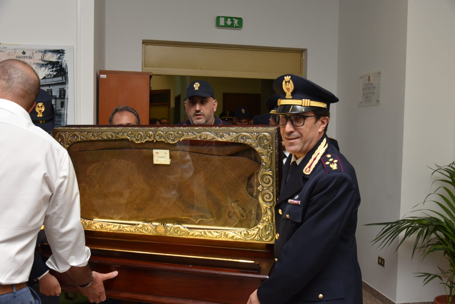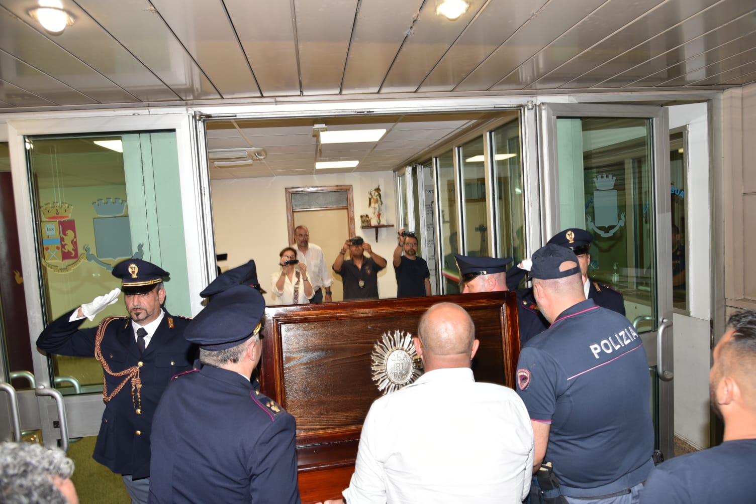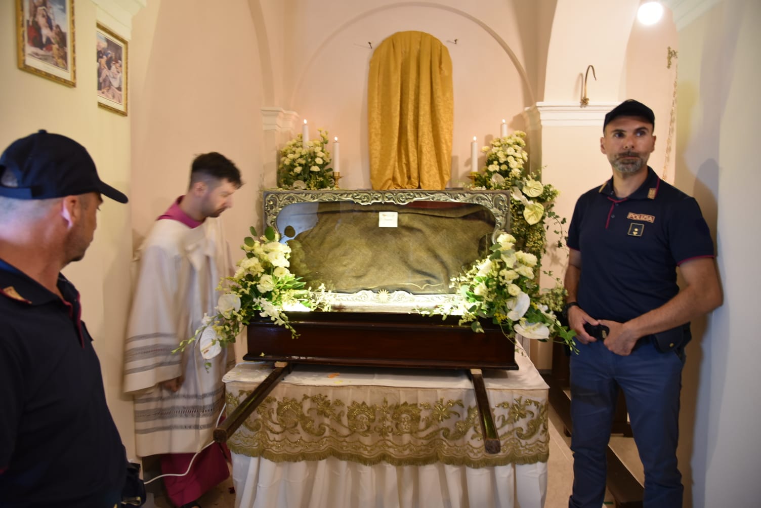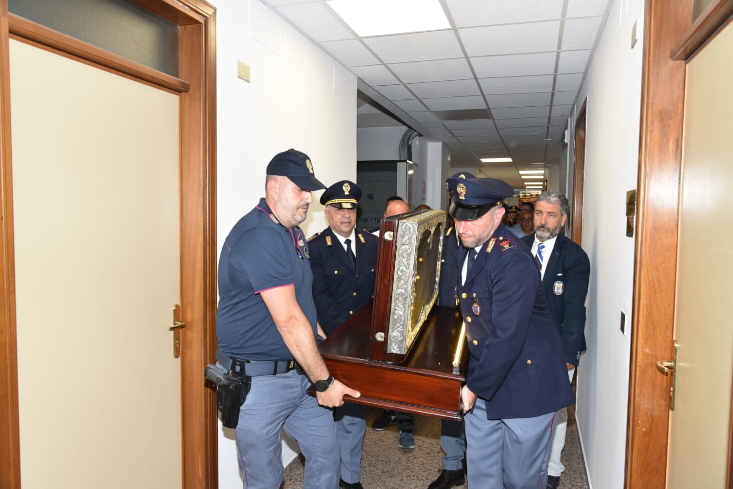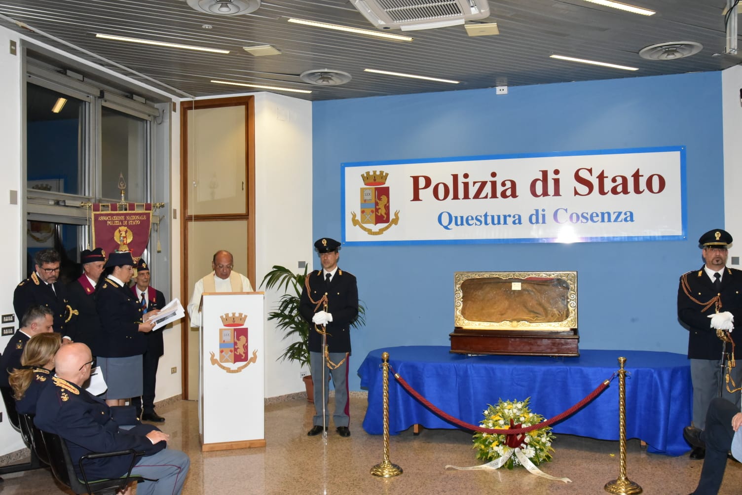 COSENZA – Il ‘Sacro Mantello’ di San Francesco di Paola ha fatto tappa oggi poco dopo la mezzanotte alla Questura di Cosenza dove è stata è stata scortata dagli agenti della Polizia di Stato all’interno della sala di rappresentanza per un momento di preghiera alla presenza del questore Giuseppe Cannizzaro e mons. Giovanni Checchinato, Arcivescovo Metropolita della Diocesi Cosenza-Bisignano. Il “Sacro Mantello”, racchiuso in una teca d’argento e vetro, venne utilizzato dal Santo come naviglio per attraversare lo Stretto di Messina da un piccolo porto della Città di Reggio Calabria, poiché deciso a raggiungere la Sicilia per visitare alcuni conventi appartenenti all’Ordine dei Minimi. La reliquia è stata trasferita nella Chiesa di San Francesco di Paola a Castrolibero situata in contrada Lucia, esposta ai fedeli per la prosecuzione delle celebrazioni civili e religiose.