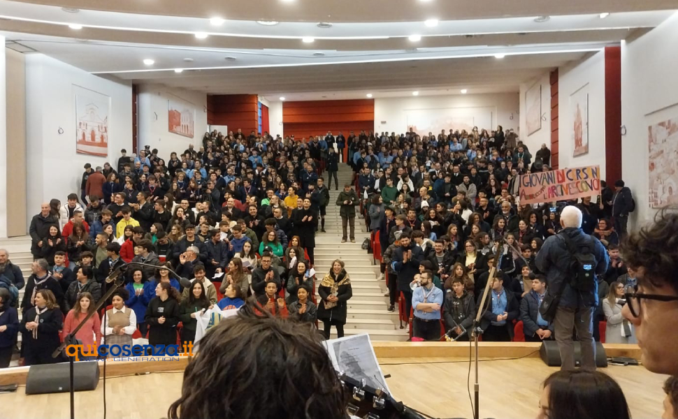 COSENZA – Grande accoglienza all’Auditorium Guarasci del liceo Telesio di Cosenza, per il nuovo arcivescovo della Diocesi di Cosenza Bisignano, mons. Giovanni Checchinato. Accolto tra applausi, canti e tanto entusiamo nella sala stracolma, il nuovo vescovo ha mostrato grande emozione e ha voluto rivolgere un messaggio importante ai ragazzi delle parrocchie cosentine, ma anche dei gruppi scout, improntato sulla libertà e sulla necessità che siano proprio i giovani a far sognare gli adulti, spesso presi dallo scoramento.