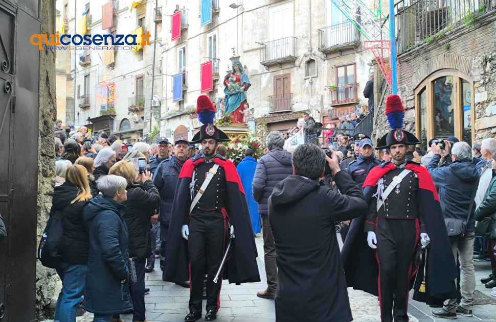 COSENZA – Si è rinnovato l’omaggio dei cosentini alla Madonna del Pilerio, protettrice della città Bruzia. Il culto alla Vergine del Pilerio, che secondo la tradizione vuol dire “pilastro” (sulla quale fu posta da monsignor Costanzo), ma anche la sua particolare funzione ecclesiale di colonna per la Chiesa, di sentinella vigile della Città. Al via questo pomeriggio la processione per le vie della città di Cosenza che oggi celebra la sua amata patrona. Dal 10 ottobre del 1988 è anche patrona principale dell’intera Arcidiocesi di Cosenza-Bisignano. Alle 16.00 in punto la statua della Madonna del Pilerio ha lasciato il Duomo di Cosenza tra gli applausi delle persone ed ha iniziato il suo percorso da Corso Telesio dirigendosi verso il centro della città.