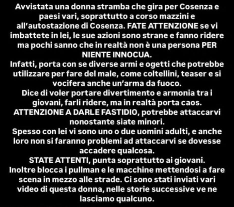 “Avvistata una donna stramba che gira per Cosenza e paesi vari, soprattutto a Corso Mazzini e all’autostazione di Cosenza. FATE ATTENZIONE se vi imbattete in lei, le sue azioni sono strane e fanno ridere ma pochi sanno che in realtà non è una persona PER NIENTE INNOCUA”. Questo l’appello che sta girando sui sociale e sulle varie app di messaggistica in queste ore. “Infatti, porta con se diverse armi e ogetti che potrebbe utilizzare per fare del male, come coltellini, teaser e si vocifera anche un’arma da fuoco. Dice di voler portare divertimento e armonia tra i giovani, farli ridere, ma in realtà porta caos. ATTENZIONE A DARLE FASTIDIO, potrebbe attaccarvi nonostante siate minori.