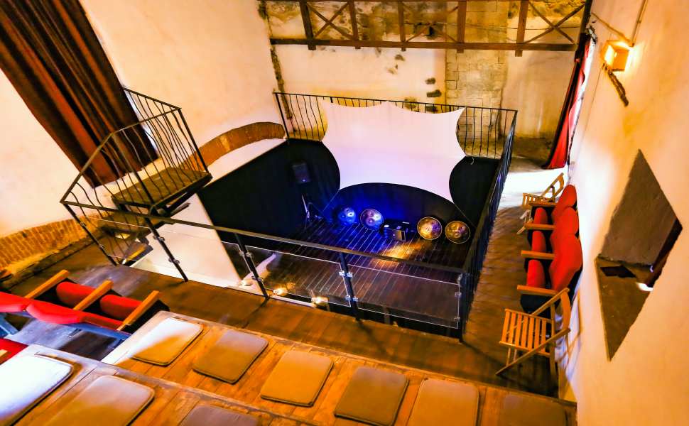 Partiti dal recupero di una montagna di caratteri mobili, è stato realizzato un laboratorio tipografico e di arti grafiche da pensare e realizzare a mano, in una prospettiva trasversale di rielaborazione e di riuso, verso la riscoperta di quelle arti e di quei saperi che in questo mondo frenetico e omologato, troppo spesso, si perdono di vista. Affianco ai cassetti pieni di caratteri di piombo, righe, spazi e barre di ferro per costruire le matrici, c’era un’altra metà della struttura sfondata, da ripensare completamente: trave dopo trave, questa vecchia costruzione diroccata, è diventata una sala con 63 posti a sedere e un piccolo palco, che ospiterà in occasione di questa apertura diversi corpi, immagini e suoni.