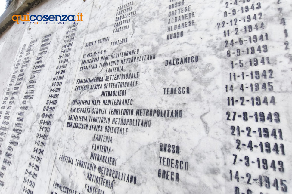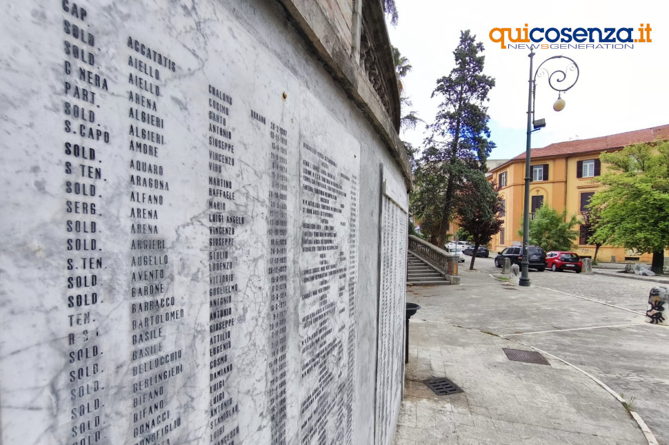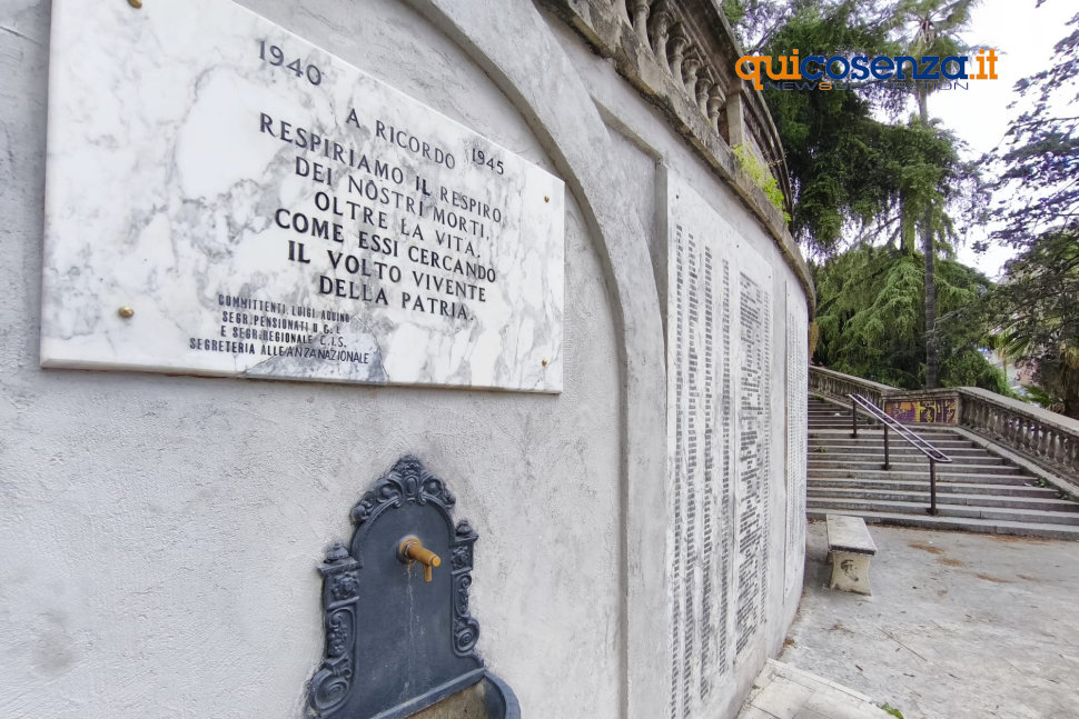Dopo aver restaurato e ripristinato la fontana, si è passati all’opera di ripulitura e restauro che ha riguardato proprio le 4 stele di marmo dove sono riportati quasi 500  nomi di tutte le persone che sono morte per difendere la patria. Adesso le 4 lastre marmoree sono tornate bianche dando dignità ad un luogo che rappresenta la memoria di Cosenza e dei cosentini.