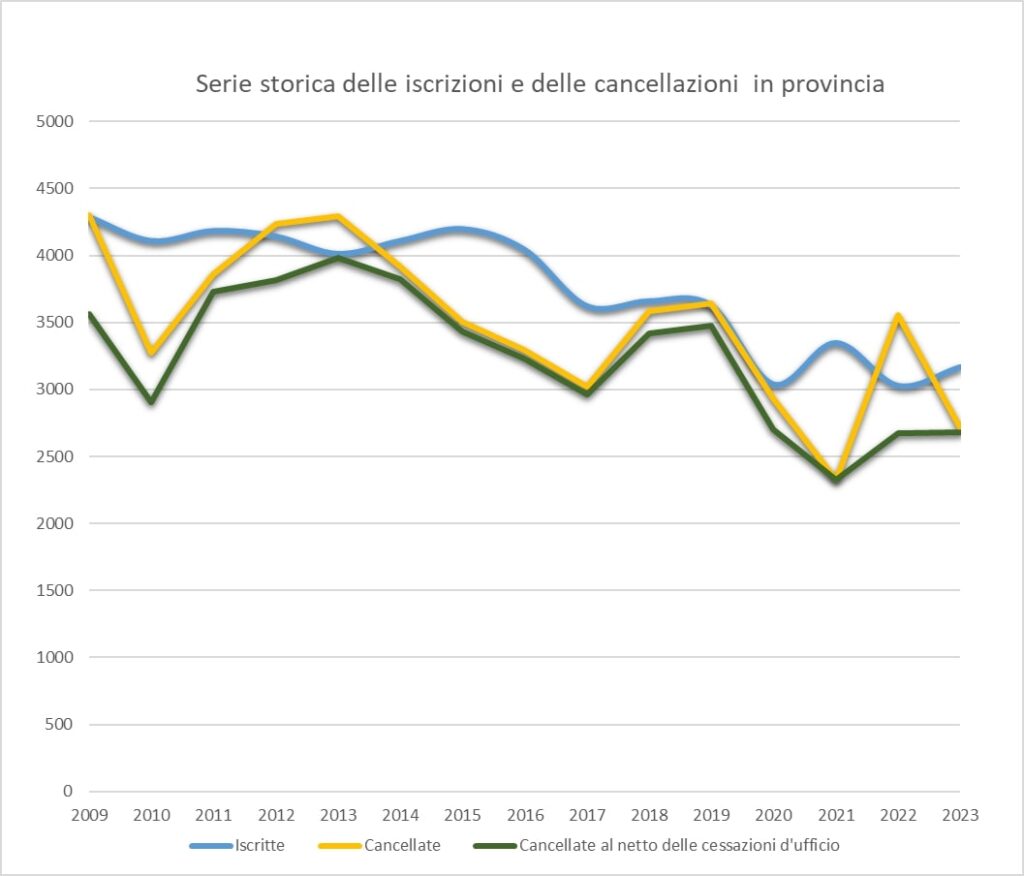 COSENZA – Crescono le nuove iscrizioni nel 2023 (+4,60%) e rimangono stabili le chiusure (0,19%), anche se i settori trainanti del commercio e della manifattura soffrono.