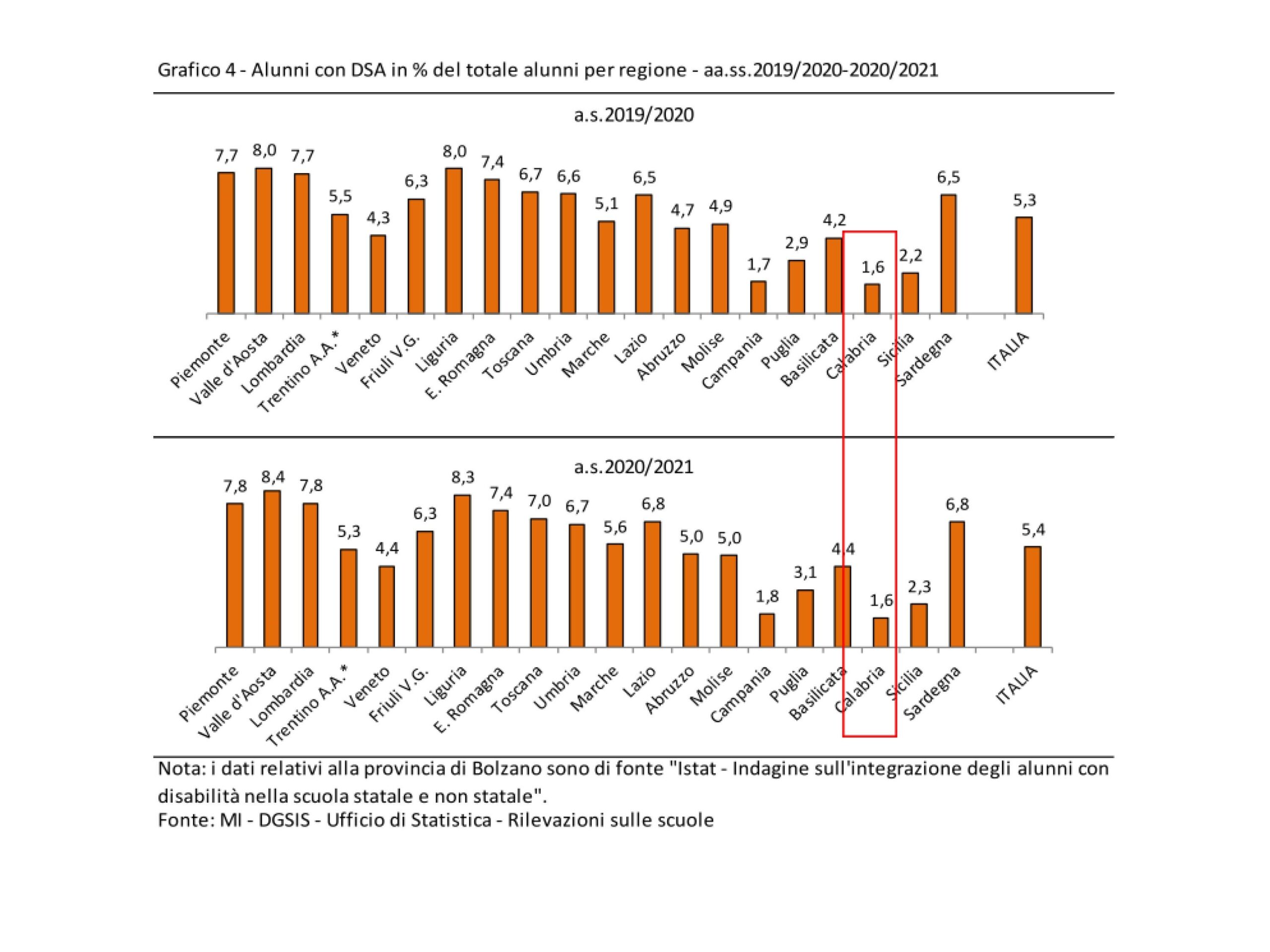 In Calabria, su una popolazione scolastica di 268.101 studenti, si registra una percentuale molto bassa di certificazioni: 1,6%. Dato l’orientamento scientifico in materia di DSA, che indica una percentuale attesa del 5% di soggetti interessati da DSA, sarebbero dunque circa 9.100 gli studenti con DSA che, non essendo diagnosticati, non possono disporre delle misure didattiche necessarie a garantire loro il diritto allo studio.