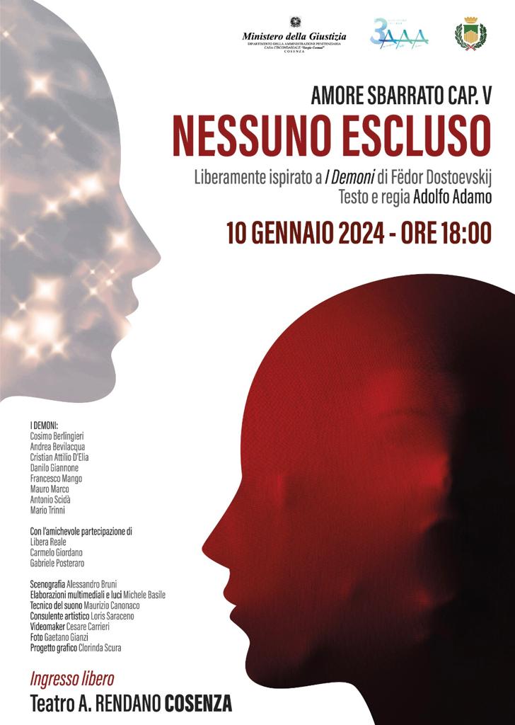 COSENZA – Liberamente ispirato a “I Demoni” di F.M. Dostoevskij, il quinto capitolo di Amore Sbarrato, “Nessuno escluso”, che andrà in scena domani sera al Teatro A. Rendano alle ore 18:00, trae spunto dalla visione della drammatica e sconcertante attualità del celebre romanzo di un gigante della letteratura per mettere a nudo, lasciando parlare il demone che è in ognuno di noi, la fragilità dell’uomo e la sua inquieta consapevolezza di essere ”doppio” e di incarnare l’eterno contrasto fra luce ed ombra, ragione ed istinto, bene e male. Un progetto teatrale avviato nel 2015 dall’attore e regista teatrale cosentino Adolfo Adamo.